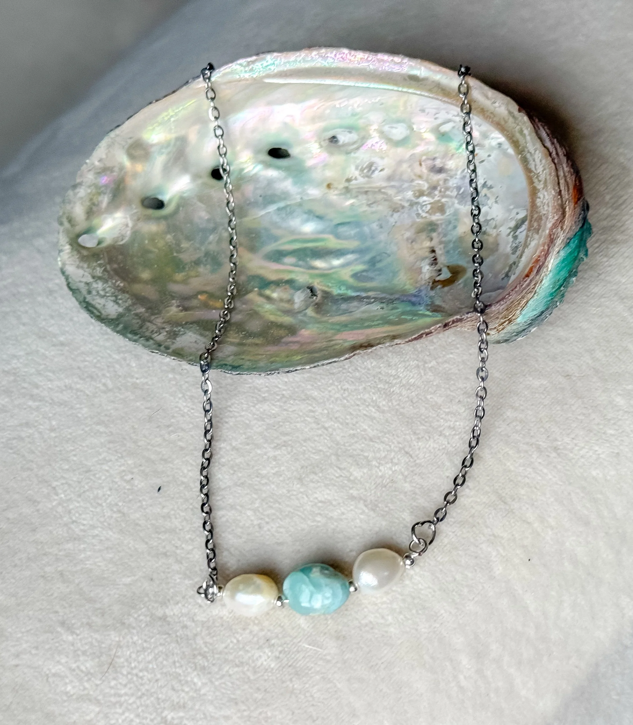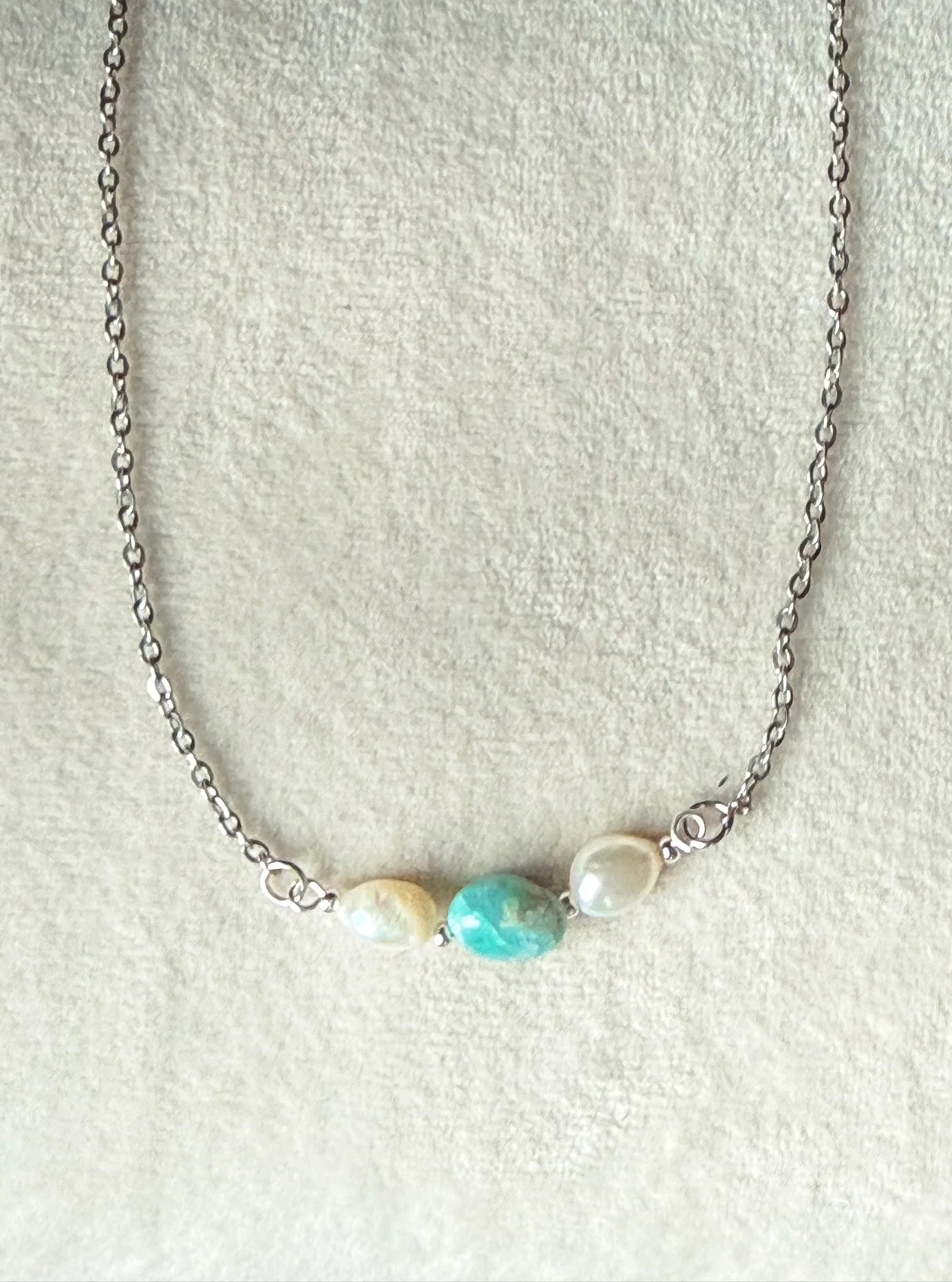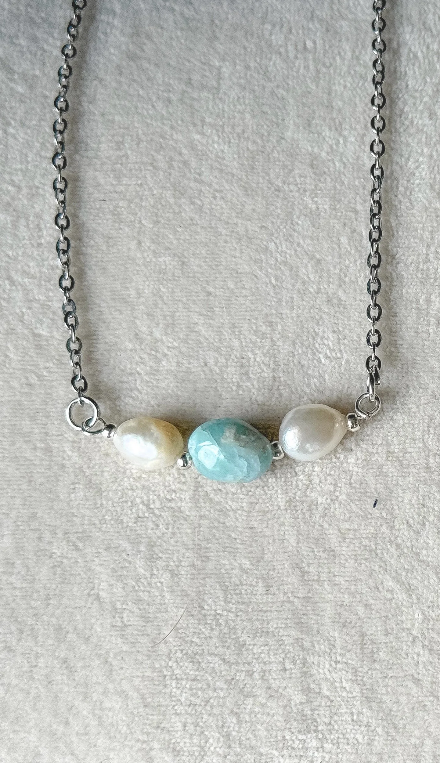 Delicate three stone necklace with pearl and larimar on silver stainless steel chain.