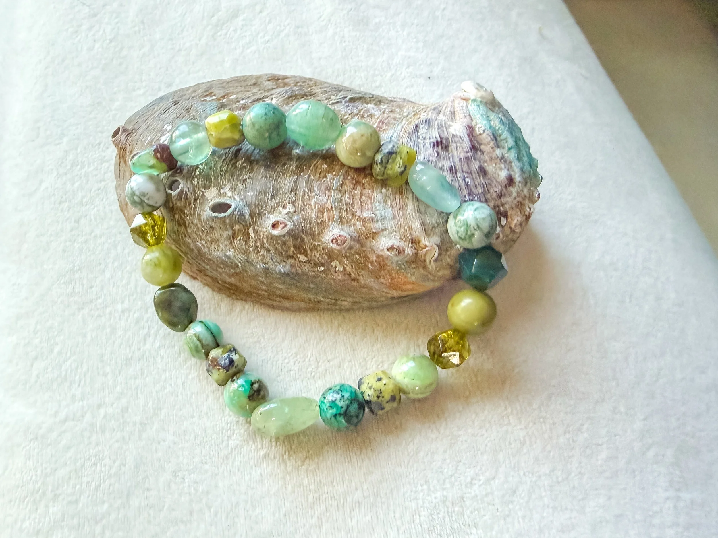 Features chrysoprase, moss agate, green Angelite, green aventurine, peridot and fluorite.